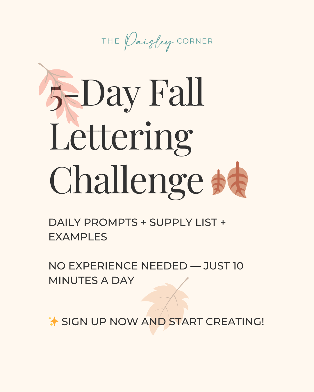 The challenge is designed to be short, simple, and cozy for the season. For 5 days, you will receive one fall-inspired lettering prompt straight to your inbox. Each prompt is quick enough to complete in under 10 minutes, making it easy to fit into your day whether you are lettering with your morning coffee or winding down in the evening.